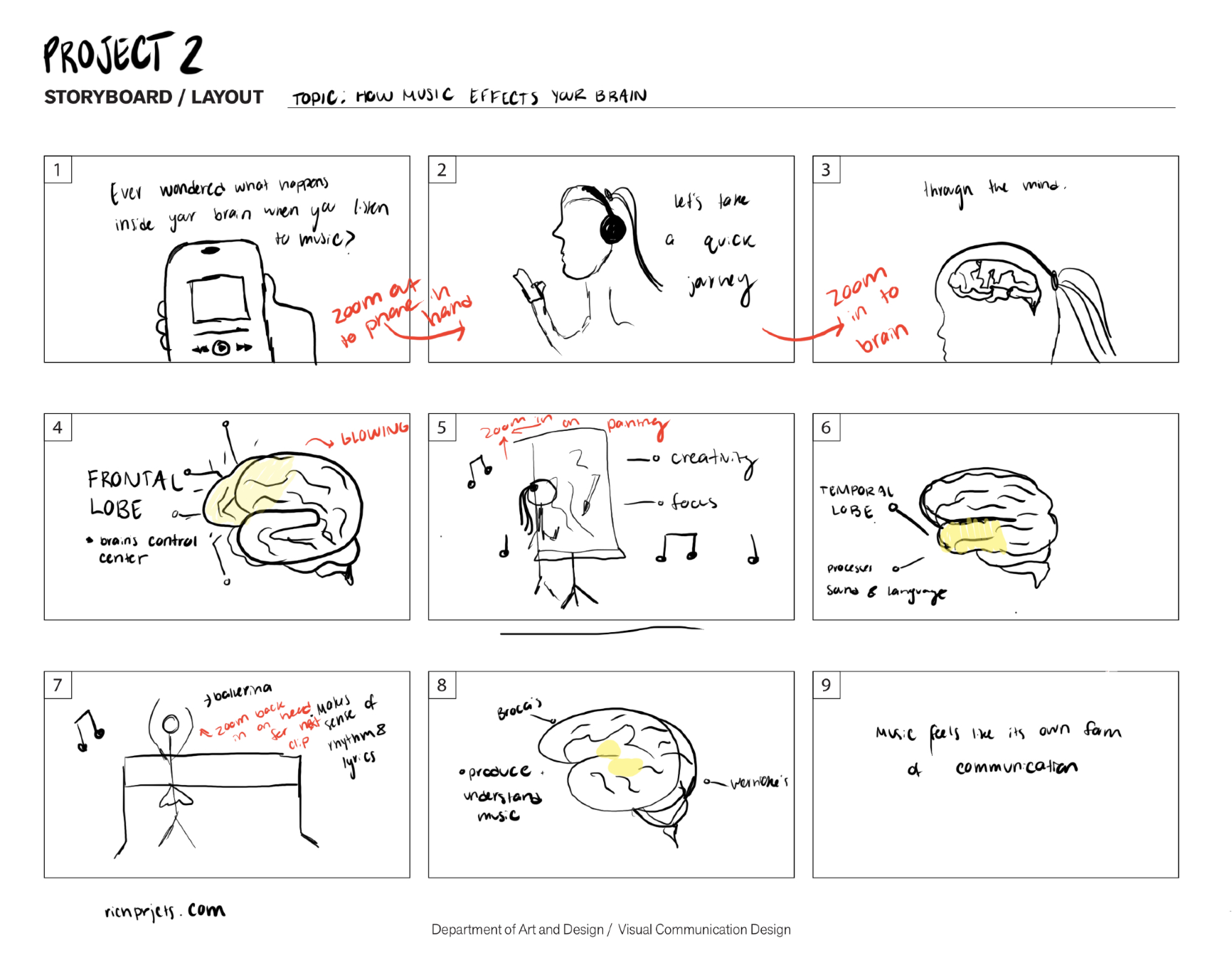 For this project, I began by creating a storyboard for my topic, which was an informational motion graphic based on what happens in your brain when you listen to music. I wanted things to look scientific, and provide visuals of a diagram of the brain along with the actions being acted out to provide a good visual of what is actually going on. As someone who is a visual learner, I thought this would be a great way to demonstrate this topic.
