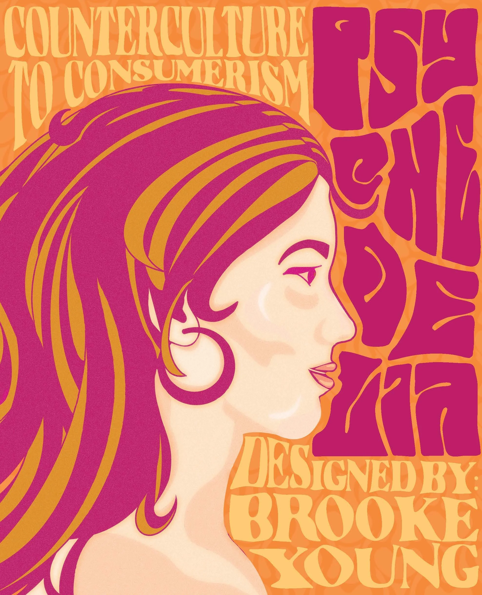 For the front and back covers, I wanted to re-create the psychedelic style band posters that were super popular at the time. I started with the illustration shown above, and then I ended up changing the colors and adding some dimension to them. For the typography, I used the puppet warp tool to create the flowing text that mimics the side profile line of the woman. I also wanted to make it so the front cover could be looked at on its own, but when layed out next to the back cover it’s a whole image.