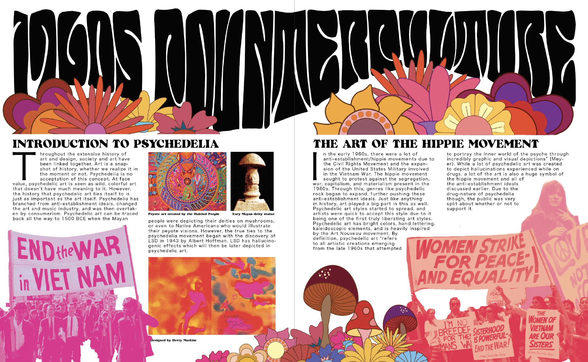 To begin this project, I started by researching some art pieces in the psychedelic style. Psychedelic art has a ton of bright colors, fun patterns, and illustrations so I tried to find ways to incorporate these elements into my design history book. That being said though, I needed to make sure I could have a good balance between having the psychedelic style and making sure that it wasn’t too overwhelming for the viewer.