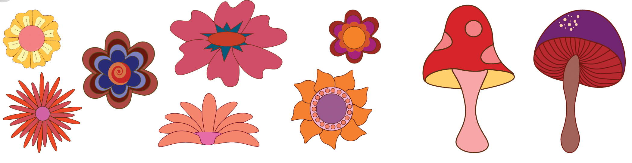 A huge part of psychedelic are illustrations and patterns. For my book, I decided to incorporate some illustrations into the design of the book to fit with the style. I created these using Adobe Fresco and Adobe Illustrator.