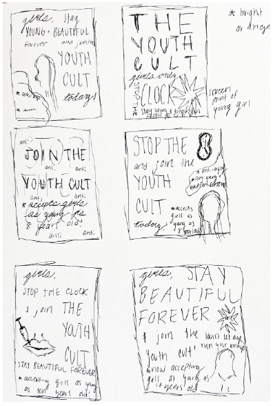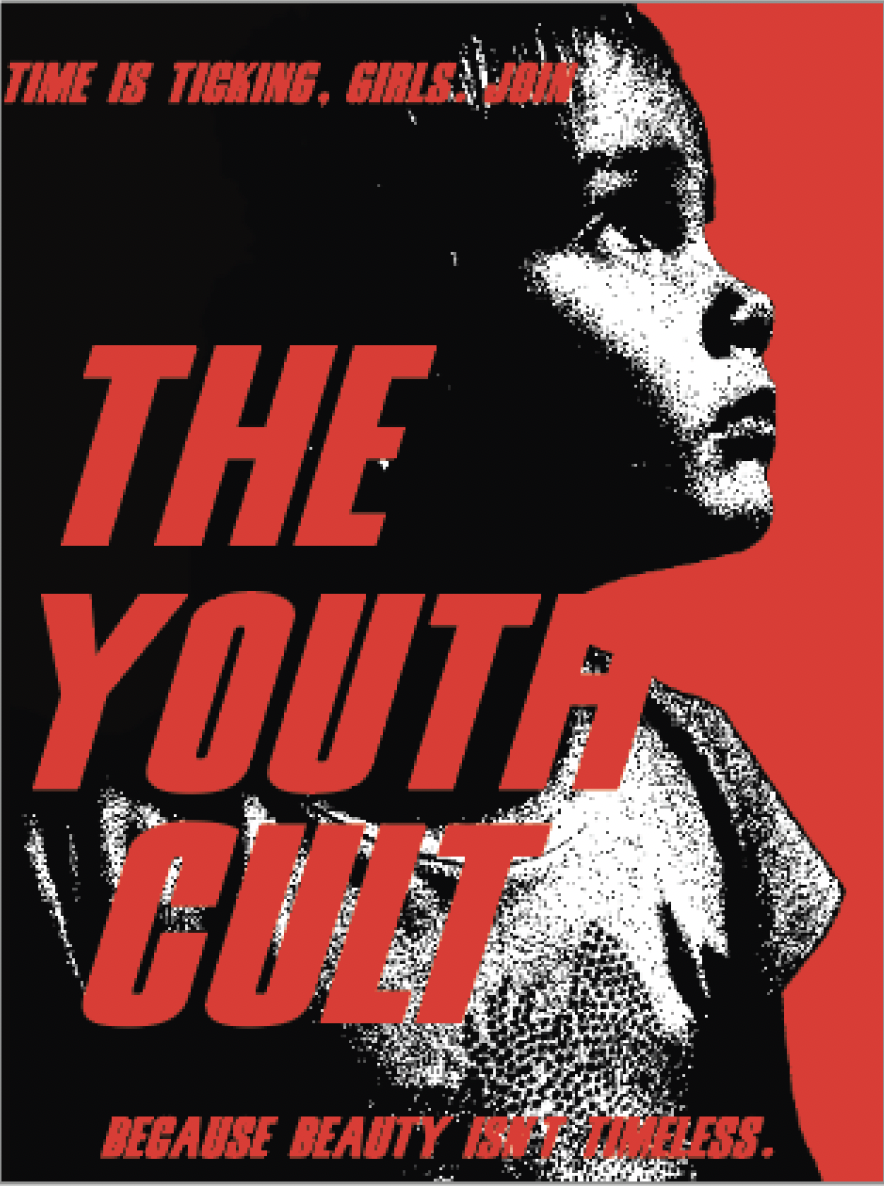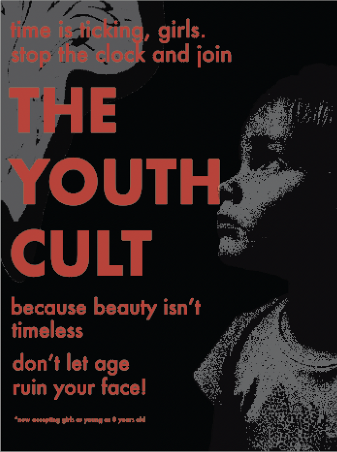 For this project, I decided to create a satirical poster about a “youth cult” in order to bring awareness to how impactful the anti-aging industry is to young girls.
