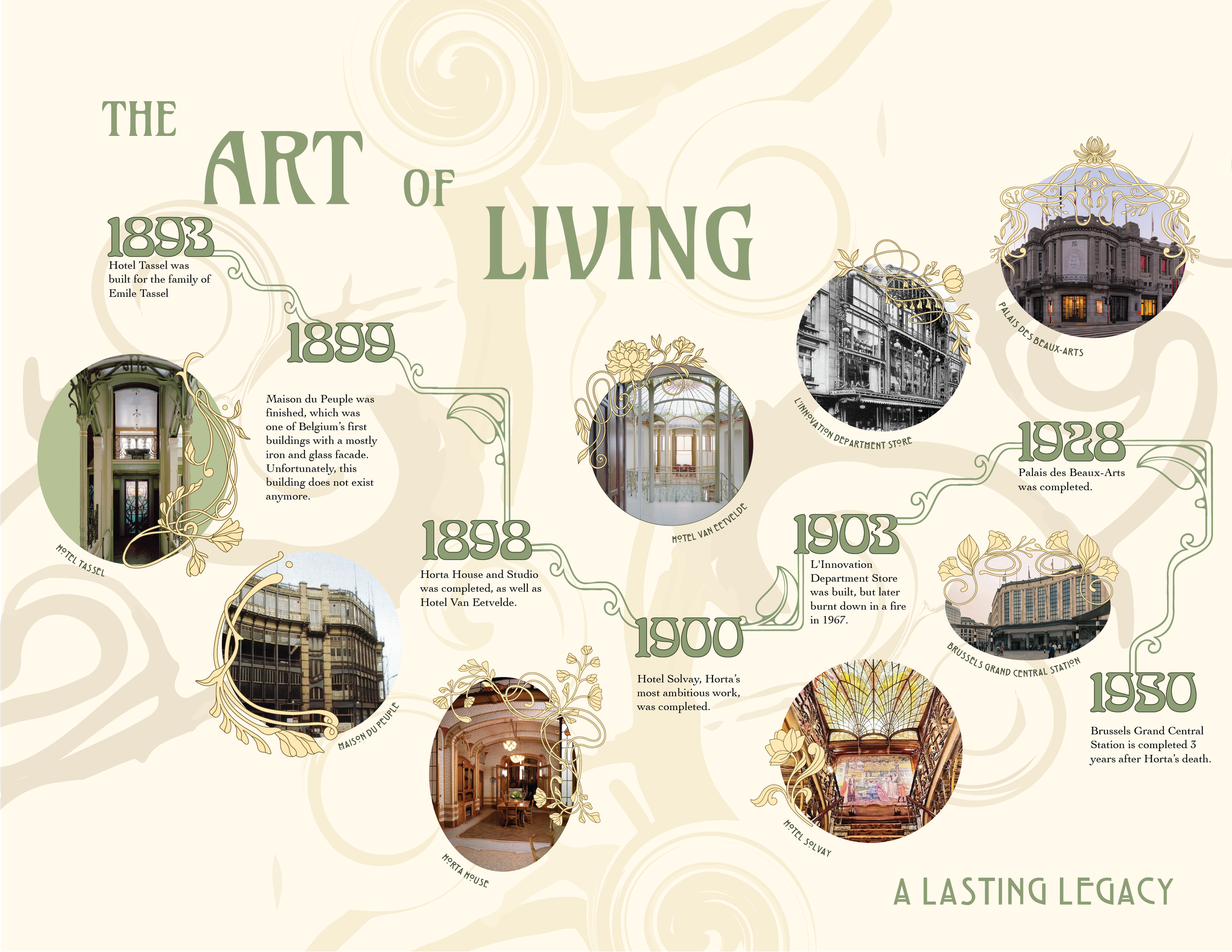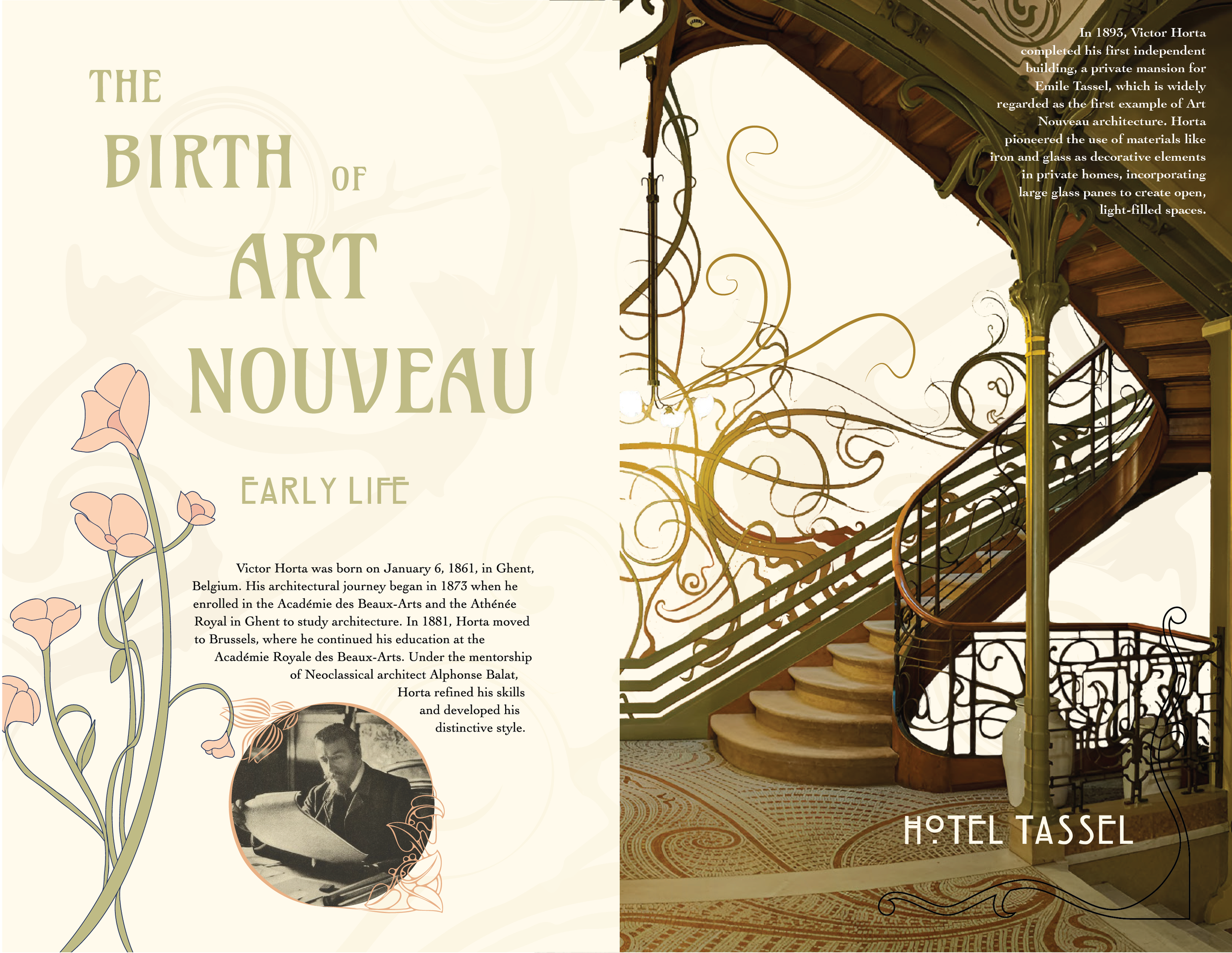 For this project, I had to create an informative booklet on an architect while experimenting with both the physical makeup of the book, as well as the design layouts. The architect I chose was Victor Horta, who is credited for starting the Art Nouveau movement in Belgium.