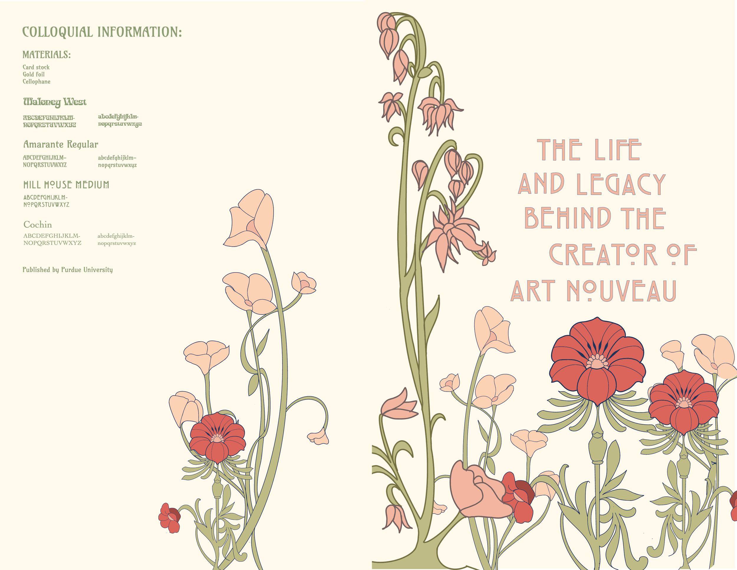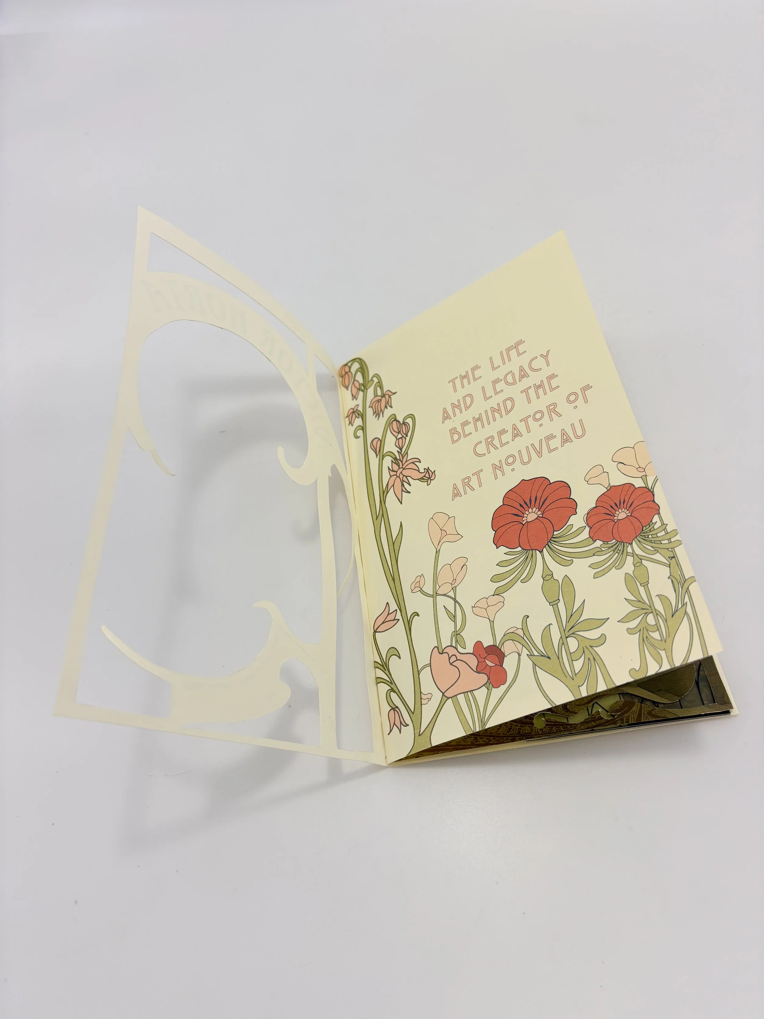 For the front and back covers, I was inspired by Art Nouveau graphic design posters that contain decorative borders. I wanted to pay tribute to these in an experimental way, so I decided to make these borders into cutouts and have a decorative illustration peep through the cutouts. This created a really interesting effect, and I think that this pays tribute to the Art Nouveau posters in a way that makes this booklet more interactive.